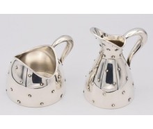 Bezeichnung: Set Milchkännchen und Zuckerschälchen 2 tlg. PunktedesignEdelmetall: 925 SilberGewicht: Zusammen: 214 gMaße: Milchkännchen: Höhe 10 cm, Ø 6,5 cm, Milchkennchen: Höhe 6,5 cm, Ø 7,7 cmPunzen: Halbmond & Krone, 925, WTBHerstellung ca.: um 1960Zustand: guter, gebrauchter ZustandZertifikat: Die Echtheit des Stückes wird auf Basis unserer...