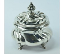 Bezeichnung: ZuckerdoseEdelmetall: 835er SilberGewicht: 272 gMaße: Länge: 12,5 cm, Breite: 11 cm, Höhe: 13 cmPunzen: 835, Halbmond & Krone, AdlerHerstellung ca.: um 1930Zustand: guter, gebrauchter ZustandZertifikat: Die Echtheit des Stückes wird auf Basis unserer 25-jährigen Erfahrung im Handel nach bestem Wissen und Gewissen bestätigt.