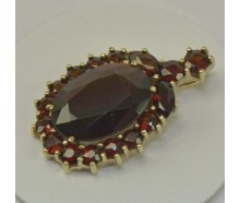 Edelmetall: 333 GelbgoldEdelsteine: 1 großer Granat 14 x 10 mm 17 kleinere GranateMaße: Länge ohne Öse: 19,2 mm, mit Öse: 26,3 mm, Breite: 16,7 mm, Öse innen: 4,0 x 1,4 mmGewicht: 3,8 gZustand: Gebraucht, siehe FotosZertifikat: Die Angaben spiegeln unsere persönliche Meinung wider, die wir uns nach bestem Wissen und Gewissen auf Basis langjähriger...