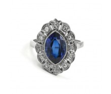 Edelmetall: 585er Weißgold (Säure geprüft)Edelsteine: 2 Altschliffdiamanten zusammen ca. 0,30 ct. Farbe: wesselton Reinheit: si - p1 30 Diamantrosen zusammen ca. 0,15 ct. 10 SafireGewicht: 2,5 gInnendurchmesser: 15,2 mmRingänderung: ja, kann geändert werden. Zustand: Gebraucht, siehe Fotosweitere Maße : Ringkopf: 11,0 x 8,3 mm, 2,7 mm hoch, Ringschiene:...