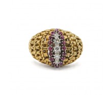 Edelmetall: 585 Gelbgold (punziert)Edelsteine: 1 Altschliffdiamant ca. 0,8 ct. 2 Altschliffdiamanten zusammen ca. 0,30 ct. 30 Altschliffdiamanten zusammen ca. 0,45 ct. 6 Altschliffdiamnten zusammen ca. 0,06 ct. Mittlerer Farb- und Reinheitsgrad 22 Rubine ca.0,44 ctGewicht: 4,4 gInnendurchmesser: 16,0 mmRingänderung: ja, kann geändert werden. Zustand:...