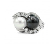 Edelmetall: 750 WeißgoldEdelsteine: 1 schwarze und 1 weiße Perle Durchmesser: ca. 7,7 mm 8 Brillanten zusammen ca: 0,40 ct. Farbe: wesselton Reinheit: siGewicht: 9,9 gInnendurchmesser: 18 mmRingänderung: ja, kann geändert werden. Zustand: Gebraucht, siehe Fotosweitere Maße : Ringkopf: 19,1 x 12,6 mm, 10,0 mm hoch, Ringschiene: 3,3 - 5,3 mmZertifikat:...