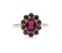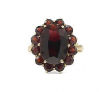 Edelmetall: 333 Gelbgold (punziert)Edelsteine: 1 Granat ca. 9 x 7 mm 10 Granate Ø ca. 2,8 mmGewicht: 2,5 gInnendurchmesser: 19,5 mmRingänderung: ja, kann geändert werden. Zustand: Gebraucht, siehe Fotosweitere Maße : Ringkopf: 14,2 x 12,0 mm, 5,6 mm hoch, Ringschiene: 1,6 - 2,4 mmZertifikat: Die Angaben spiegeln unsere persönliche Meinung wider, die wir...