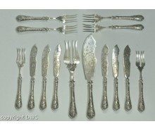 Bezeichnung: BesteckEdelmetall: 800er SilberGewicht: 962,32 gMaße: Messer: Länge 21 cm Gabel: Länge 19 cm Vorlegemesser: Länge 27 cm Vorlegegabel: Länge 24 cmPunzen: 800, Halbmond und Krone ,TierpunzeHerstellung ca.: um 1890Zustand: gereinigter guter ZustabdZertifikat: Die Echtheit des Stückes wird auf Basis unserer 25-jährigen Erfahrung im Handel...
