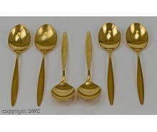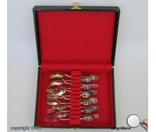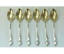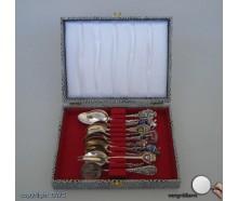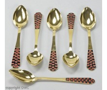 Bezeichnung: 6 KaffeelöffelEdelmetall: 916 SILBER, VERGOLDET, EMAILLIERTGewicht: 142 GRAMMMaße: LÄNGE: 14,5 CM, BREITE: 3 CMPunzen: A 108, HAMMER UND SICHEL, FRAUENKOPFHerstellung ca.: UM 1920Zustand: GEBRAUCHTER SEHR GUTER ZUSTANDZertifikat: Die Echtheit des Stückes wird auf Basis unserer 25-jährigen Erfahrung im Handel nach bestem Wissen und...