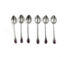 Bezeichnung: 6 Mokkalöffel mit AmethystEdelmetall: 900 SilberGewicht: 71,6 gMaße: Länge: 9,8 cm, Breite: 2,1 cmPunzen: Plata, 900, AntonHerstellung ca.: um 1960Zustand: guter, gebrauchter ZustandZertifikat: Die Echtheit des Stückes wird auf Basis unserer 25-jährigen Erfahrung im Handel nach bestem Wissen und Gewissen bestätigt.