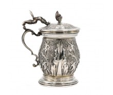 Bezeichnung: Silberkrug, Weinkrug, Deckelhumpen Österreich Ungarn Wien 1855 13 Lot Silber, Putten und Weintrauben, innen feuervergoldetEdelmetall: SilberGewicht: 528 gMaße: Höhe: 18,5 cm, Durchmesser: 10 cm, Inhalt ca. 0,5 l.Punzen: A, 13, 1855Herstellung ca.: 1855Zustand: Guter, altersbedingter ZustandZertifikat: Die Echtheit des Stückes wird auf Basis...