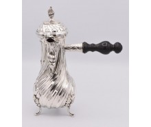 Bezeichnung: Schokoladen Kanne mit Ebenholzgriff , abnehmbarer Deckel mit RührstabEdelmetall: 925 SilberGewicht: 720 gMaße: Durchmesser: ca. 11,00 cm Ø, Höhe: 25,5 cmPunzen: 925, P.V.Herstellung ca.: 1890Zustand: guter, gebrauchter ZustandZertifikat: Expertise von 1997 über 4500 DM
