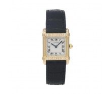 Marke: CartierAbteilung: DamenWerksinfos: QuarzwerkFunktionen: Minuten, StundenGehäuse: 750 Gelbgold mit 24 Brillanten, Krone mit DiamantDurchmesser: 27,7 x 21,0 mmArmband: Schwarzes Lederarmband mit Faltschließe in 750 RosegoldBesonderheit: 24 Brillanten zusammen ca. 0,24 ct., Krone mit DiamantZustand: Getragen, siehe FotosBox/Papiere:...