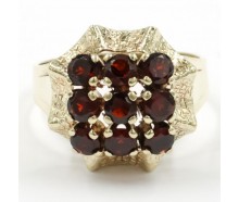 Edelmetall: 585 Gelbgold (punziert)Edelsteine: 9 Granate Ø ca. 3,4 mmGewicht: 4,82 gInnendurchmesser: 17,5 mm ØRingänderung: ja, kann geändert werden. Zustand: Gebraucht, siehe Fotosweitere Maße : Ringkopf: 15,6 x 15,6 mm, 8,5 mm hoch, Ringschiene: 2,7 - 5,2 mmZertifikat: Die Angaben spiegeln unsere persönliche Meinung wider, die wir uns nach bestem...