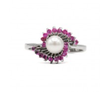 Edelmetall: 750 WeissgoldEdelsteine: 1 Perle Durchmesser / 6 mm seidiger Glanz 8 Rubine zusammen ca. 0,12 ct leuchtende Farbe 2 Kristalle 4 x 2,2 mm Goldschmiede Arbeit schönes DesignGewicht: 2,5 gInnendurchmesser: 17,5 mmRingänderung: ja, kann geändert werden. Zustand: gereinigt und poliertweitere Maße : Ringbreite / 2 mm; Ringkopf: 13,6 x 9 mm 10 mm...