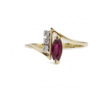 Edelmetall: 585 Gelbgold (punziert)Edelsteine: 1 Rubin im Navetteschliff Gewicht ca. 0,28 ct. 3 Brillanen Gewicht zusammen ca. 0,45 ct. Farbe: wesselton Reinheit: si Gewicht: 2,0 gInnendurchmesser: 17,0 mmRingänderung: ja, kann geändert werden. Zustand: Gebraucht, siehe Fotosweitere Maße : Ringkopf: 11,0 x 6,1 mm, Höhe: 4,1 mm, Ringschiene: 0,8 - 2,0...