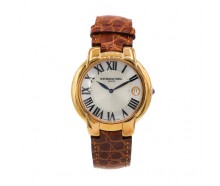 Marke: CartierAbteilung: UnisexWerksinfos: Automaticwerk Cal. 049 21 SteineFunktionen: Sekunden, Minuten, Stunden, DatumGehäuse: 750 Gelbgold, verschraubter Boden, SafirglasDurchmesser: 35,5 mmArmband: Original Cartier Lederband mit Dornschließe in 750 GelbgoldBesonderheit: Kronenabdeckung mit Diamant statt Saphir, Perlmuttzifferblatt mit 8...