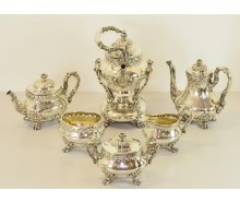 Bezeichnung: Kaffee/Teegarnitur Service T.B. Starr New York (1877 - 1923), 7 teilig, auf Tatzenfüßen, Monogramm: MarvinEdelmetall: 925 SilberGewicht: zusammen: ca. 6350 gMaße: Kaffeekanne Höhe: 22 cm, 1190 g; Teekanne Höhe: 17 cm, 1010 g; Wasserkanne Höhe: mit Henkel: 25 cm, 1300 g; Stövchen Höhe: 19 cm, 1260 g; Milchkännchen Höhe: 13 cm, 448 g;...