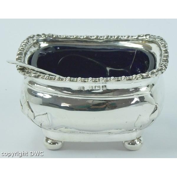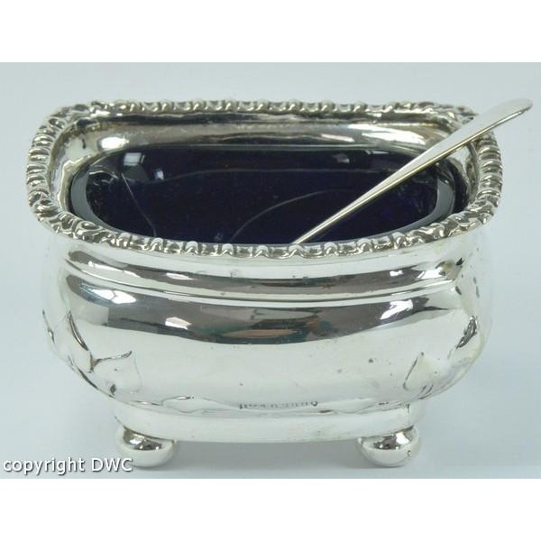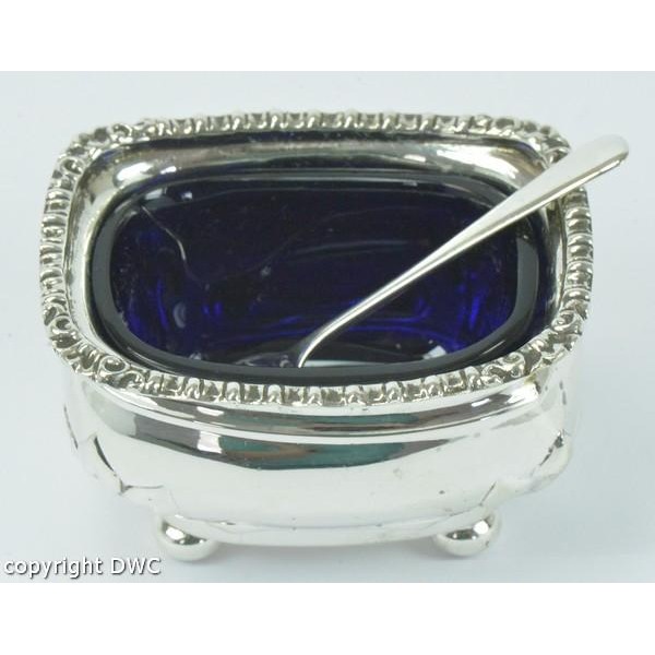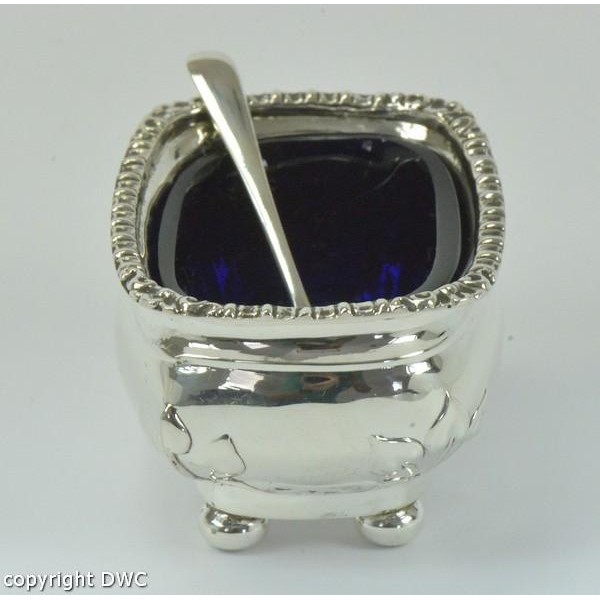 Gewürzschälchen aus 925er Silber mit Kobaltglas und Löffel Birmingham 1906 .