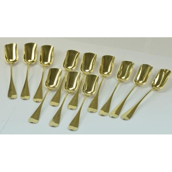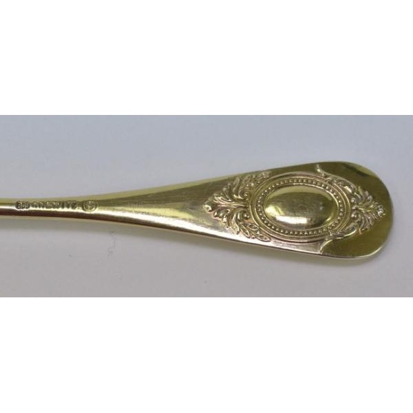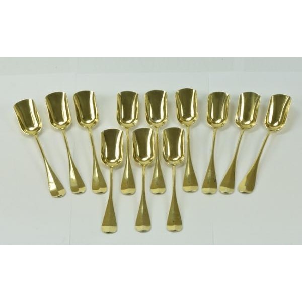 • Bezeichnung: 12 Eislöffel, Dessertlöffel KNEWITZ in 800 Silber vergoldet mit länglicher Laffe in alter Box von Silberschmied Weißhaupt, München
