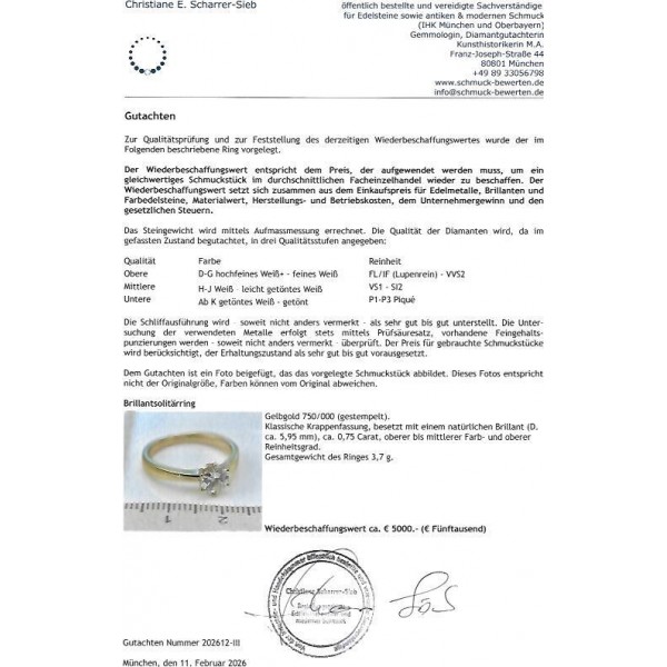 Ring mit Diamant Brillant Solitär 0,75 ct in 750 18 kt Gold Gr.54 IHK Expertise