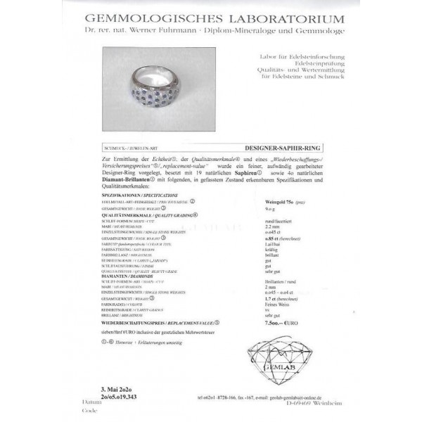 Ring mit Safiren und Brillanten in 18 Kt. 750 Weißgold Gr. 55 mit Gutachten