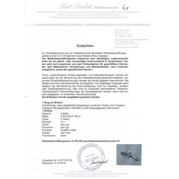 Ring mit Brillantsolitär 0,85 ct. in 18 Kt 750 Gold Grösse 53 IGI Expertise