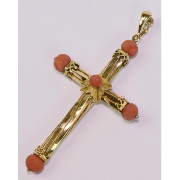 Clip Anhänger Kreuz Kruzifix mit Koralle in aus 14 Kt. 585 Gold antik