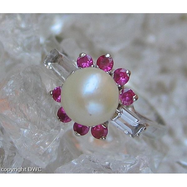 Ring mit Perle Rubine Kristalle in aus 18 Kt 750 er Gold Grösse 55 top!