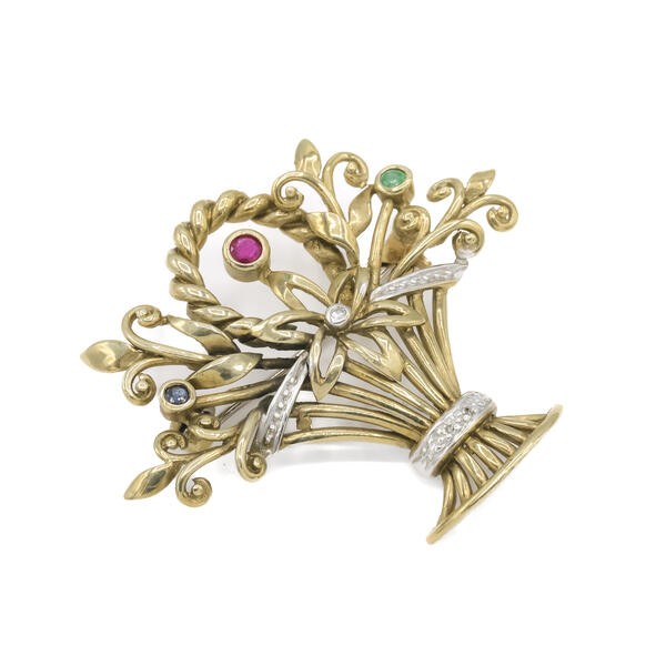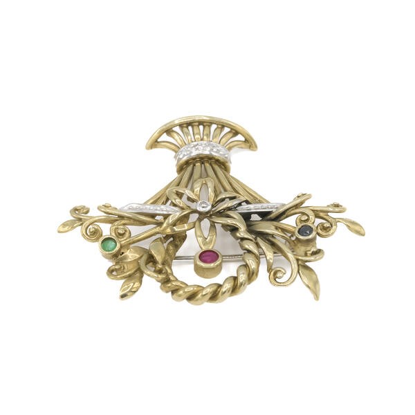 Brosche mit Safir Rubin Smaragd und Diamanten 8 Kt. 333 Gelbgold Sammlerstück