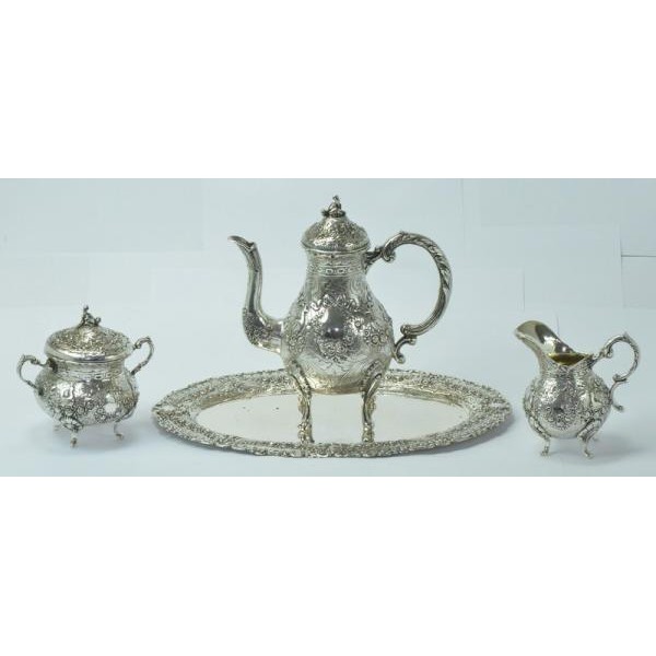 Prunk Mocca service in aus 800 er Silber 4 teilig mit Tablett antik